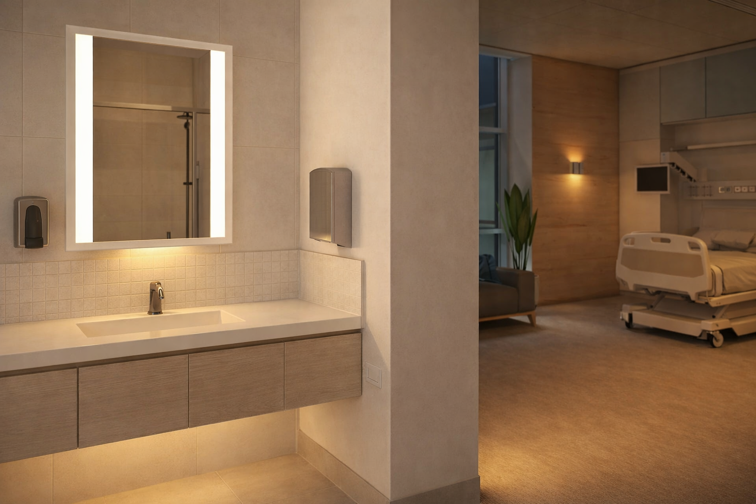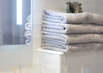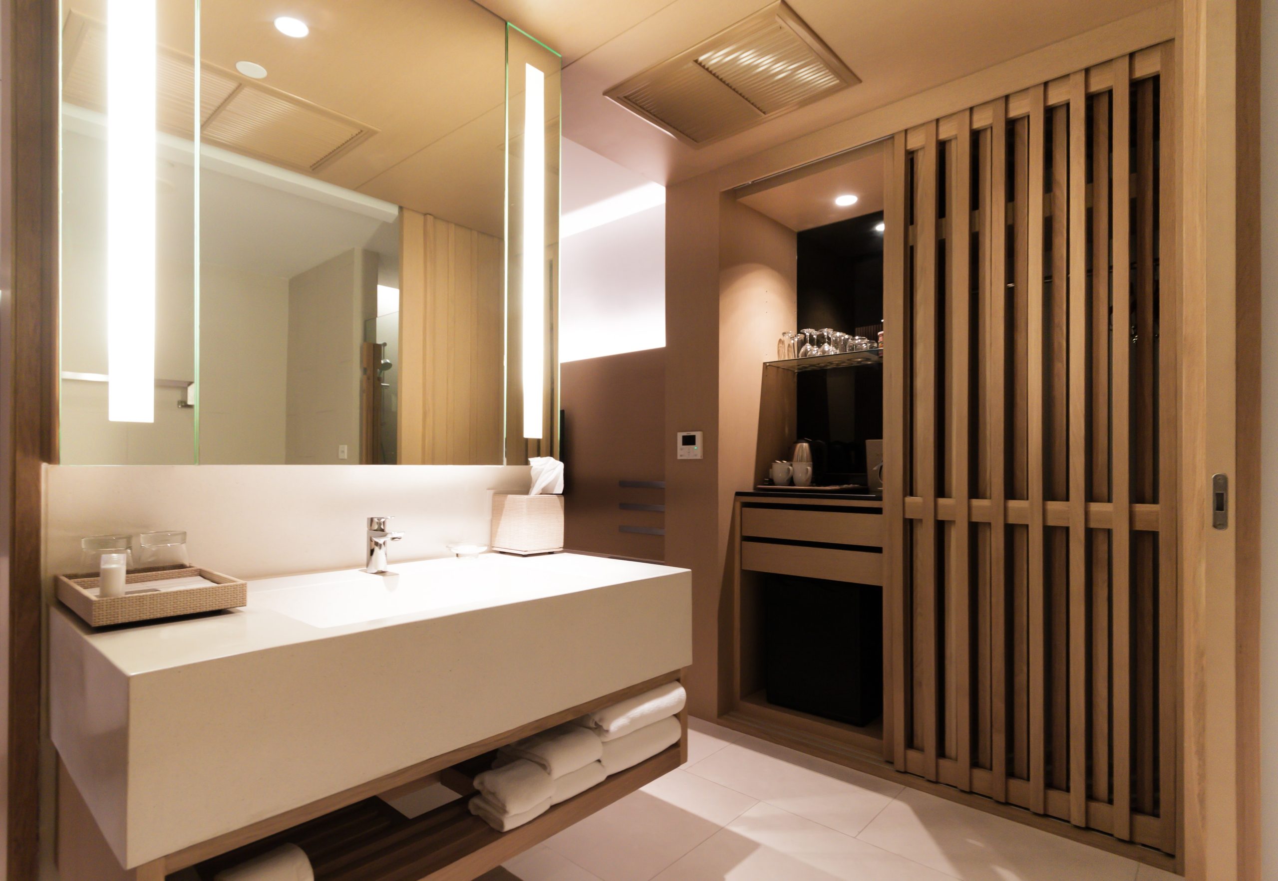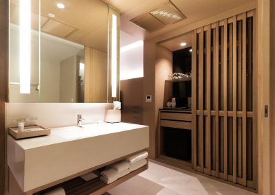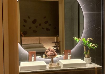 Additionally, lighted dressing mirrors are also becoming more visible in this application and both have become the gold standard of the hospitality industry! Have your logo frosted and illuminated on the mirror as well for an increased personalization.