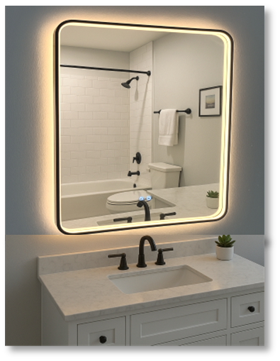 The Shadow Glow Series offers an inward facing illumination within a shadow box frame that creates the perfect glow in your space. A backlit option is also available to enhance your design aesthetic. This mirror offers greater illuminance with half the power consumption of traditional LED mirrors with a fully customizable rectangular or square silhouette. The optional one-touch dimming system allows you to choose the perfect light intensity and color temperature—from a cool 5,000K task lighting to a warm, sunlit 2,700K glow. Elevate your experience even further with upgrades like an integrated night light, a built-in Bluetooth speaker, and other user-friendly features that transform your mirror into a personalized statement of style and function.